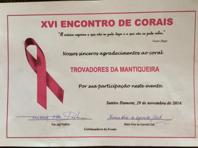 Ao final de nossa apresentação, a coordenação do XVI Encontro de Corais conferiu aos regentes o diploma comprobatório de sua participação no evento. Assinam pela coordenação do evento Frederik Otto Postma (nome religioso: frei Joel Postma o.f.m.) e Maria Alice de Azevedo Sad (simultaneamente, pianista e regente do Coral Tajapanema).